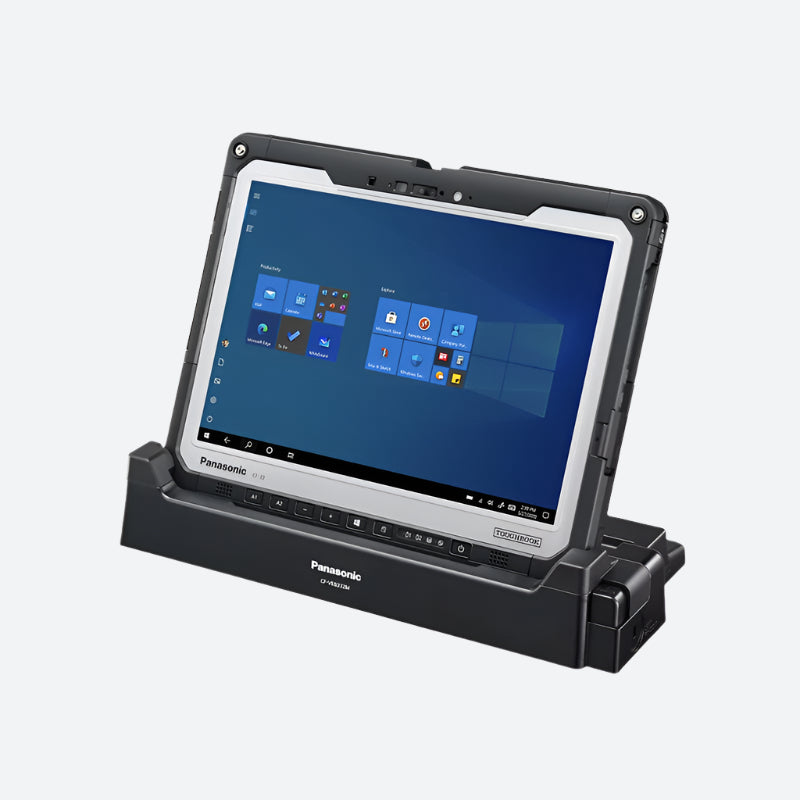 Tablet mode Desktop Dock Cradle for CF-33. USB 3.0 (2), USB 2.0 (4), HDMI (2), Serial, LAN (2), Kensington Lock. No AC Adapter Included.