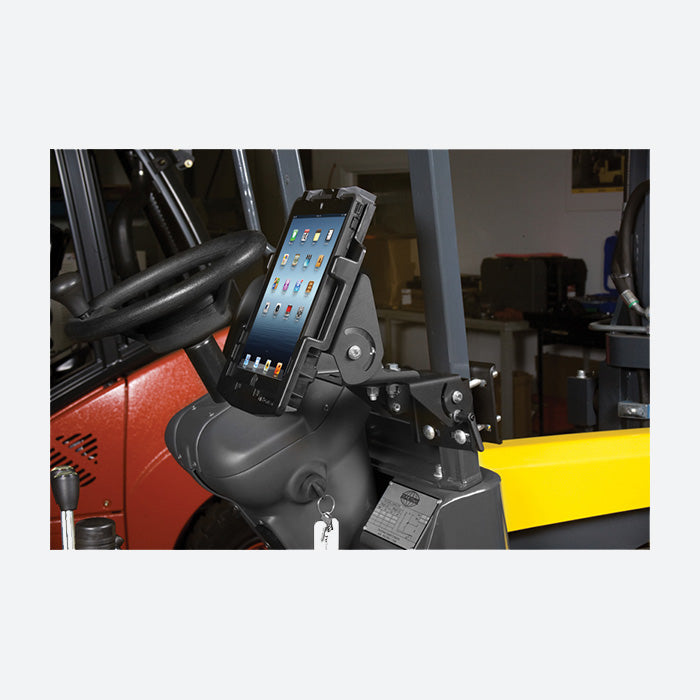 Able to mount easily to an overhead guard leg by clamping with bolts, the Gamber Johnson 7160-0357 Clam Shell with Small Plate can be a stand alone mount or be paired with other Clevis motion attachments and extending arms to add increased functionality. With AMPS, NEC and 75 mm VESA mounting patterns, the 7160-0357 is able to accommodate a wide variety of motion attachments, mounts and docks. The 7160-0357 fits to a forklift support brace 1.5 to 2.5 inches wide, if a larger plate is needed please consider the alternative Gamber Johnson piece 7160-0370 with a large plate. With a 160 up and down tilt, the included clevis would be perfect for a low profile tablet dock solution. Built out of heavy gauge and rugged materials, the 7160-0357 and most other Gamber Johnson parts are built to withstand the heaviest of abuse and are perfect for material handling work conditions. Let a sales rep help build the 7160-0357 into a complete computer mounting solution with a computer dock or cradle and other suggested pieces, give us a call at 816-388-0035