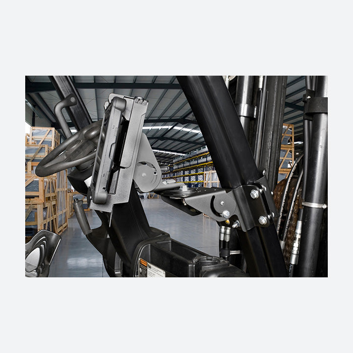 Ideal for a computer mounting solution in a warehouse environment, the Gamber Johnson 7160-0420 Dual Clamshell with Articulating Arm and Small Plate installs easily and quickly and can be positioned to the optimal location. Able to support small to large tablet mounts, the 7160-0420 attaches directly to an overhead guard mount on a forklift. With an AMPS, NEC, VESA 75mm and Gamber Johnson 2x4 mounting patterns, the 7160-0420 can accommodate virtually any Gamber Johnson or competitor tablet dock or cradle. With multiple points of articulation including tilt and multiple points swivel, the 7160-0420 provides much needed articulation to maximize the ergonomics of the computer. Our sales reps at Rugged or Die would be pleased to answer any questions you might have about the 7160-0420 or help craft the optimal computer mounting solution for your warehouse management environment, give us a call at 816-388-0035