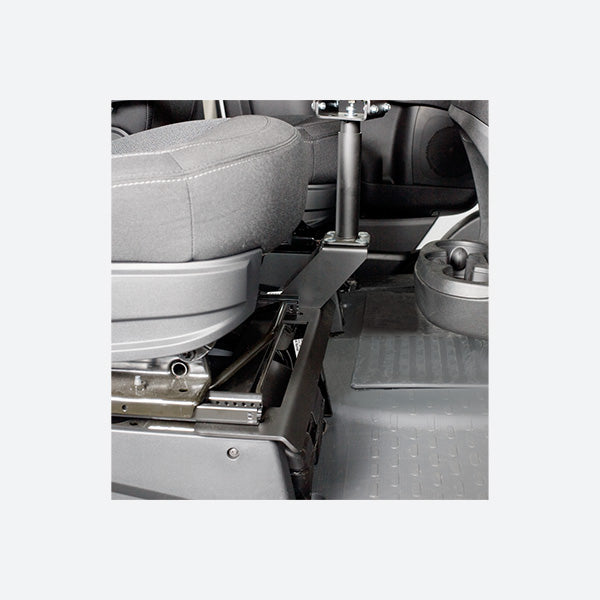 - Base is designed to be secured between the passenger seat pedestal and the seat rails.