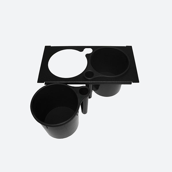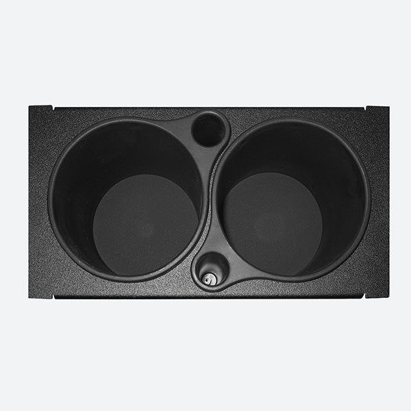 - Black powder coat finish on metal bracket with opening for two individual cup inserts.