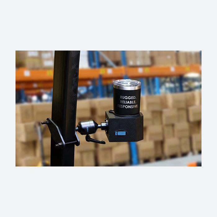 An unsung hero of an equipment package, the cupholder can be a critical component of vehicle equipment, holding not only drinks but also small components and equipment. With an included AMPs hole pattern, the Gamber Johnson Forklift Cup Holder Bracket 7160-1297 comes ready to be mounted on numerous Gamber Johnson small item Zirkona mounts that can in turn attach to a large number of forklift guard legs and can be positioned to optimal location. The removable plastic cup also features a pen holder. Let a Rugged or Die sales rep help complete your material handling equipment solution, give us a call today at 816-388-0035 or send us an email at sales@ruggedordie.com.