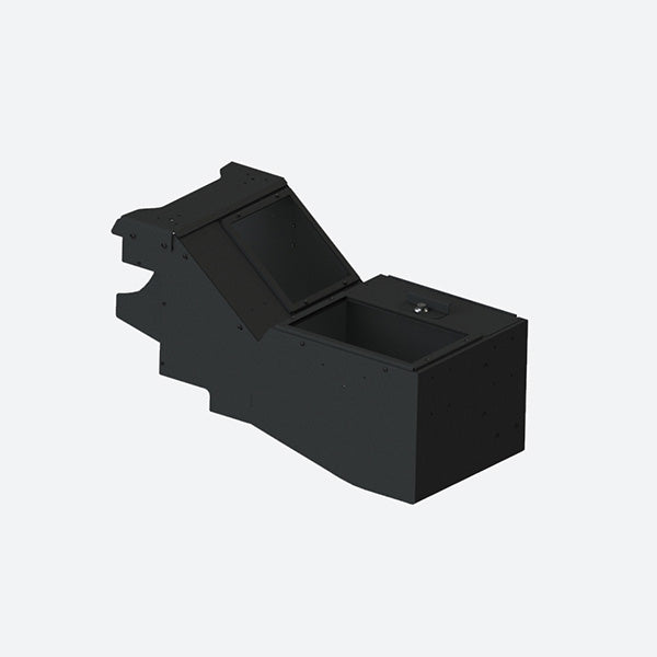- Push-button locking storage compartment with one (1) rectangular cutout and one (1) 12V outlet cutout