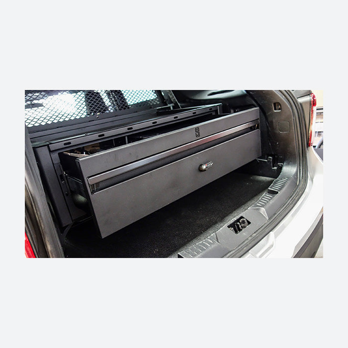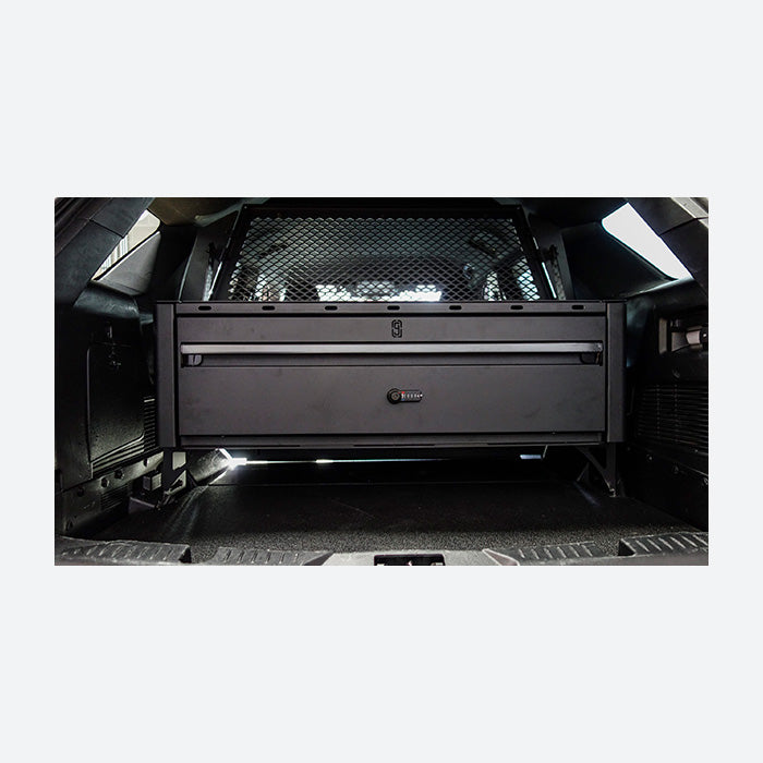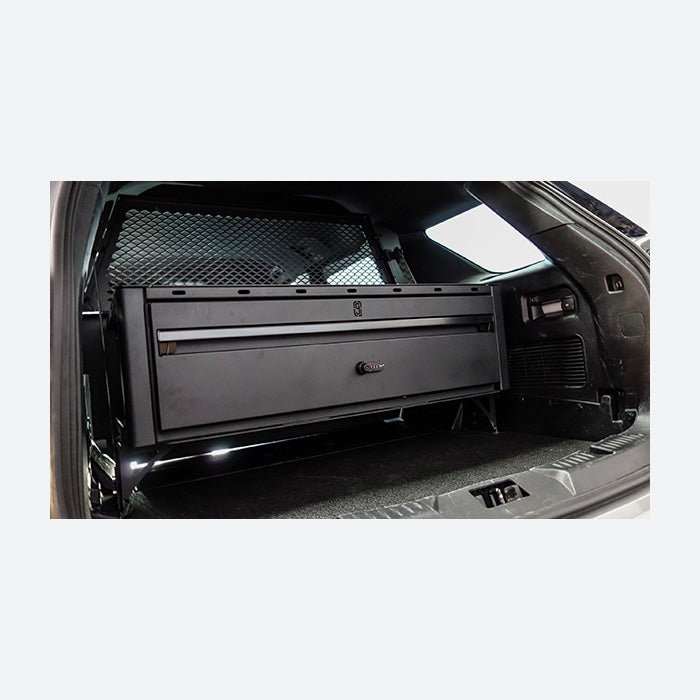 The Gamber Johnson Trunk Drawer 7160-1498 is a versatile storage solution that is compatible with a number of different vehicles. Providing a numbered combination lock that can also be manually overridden with a master key, the 7160-1498 offers safe storage of valuables of sensitive equipment. The 7160-1498 requires a vehicle specific leg kit (sold separately) to mount but can be installed in most fleet vehicles. The 7160-1498 features an inverted top with bungie cord mounts to secure cords or cargo nets for additional equipment storage. Call the Rugged or Die sales department at 816-388-0035 to determine which leg kit is required for your vehicle to correctly mount the 7160-1498.