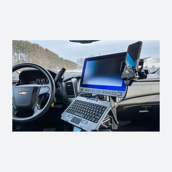 Providing secure mounting and universal fit, the Gamber Johnson Universal Phone Charging and Data Cradle 7160-1659-00 can accommodate virtually any phone. With ratcheting side arms that release with a one-push button and a silicone strap to optionally fold over the top, the 7160-1659-00 cradle will keep the phone securely mounted. The 7160-1659-00 features a USB-C charging and data transfer cable allowing the phone to charge while mounted or connect as a peripheral screen to a vehicle mounted computer solution. The 7160-1659-00 cradle is different from the 7160-1659-10 cradle in that the USB-C charging cable on the 7160-1659-00 can be changed out for an alternate cable depending on the type of phone being used. If you need assistance mounting your phone or completing a vehicle equipment setup, Rugged or Die sales reps would be happy to provide a free consultation and or quote, just email us at sales@ruggedordie.com