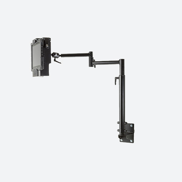 Gamber Johnson Zirkona height adjustable wall mount is designed to be a low profile mounting solution that can install a tablet on any flat surface. Zirkona articulating knuckle and arm allows the tablet to be positioned at the optimal angle and distance from mounting solution. A computer dock or cradle would be required to complete the mounting solution.