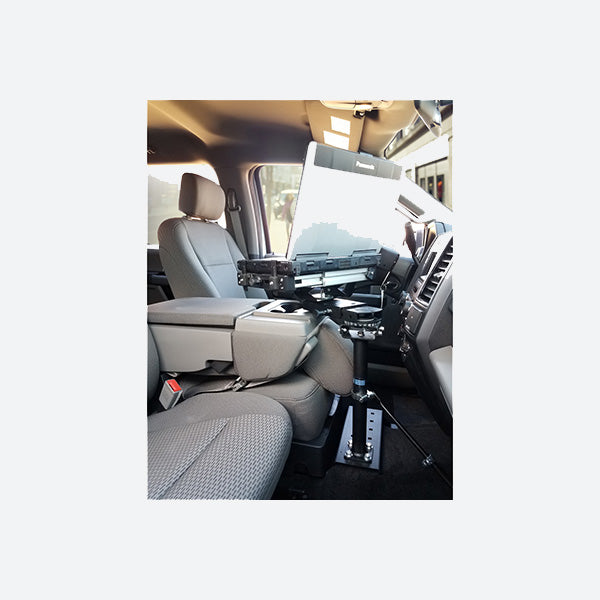 Gamber Johnson vehicle base mounting kit for 2015+ Ford F-150 and 2017+ Super Duty F-250 - F-550. Vehicle base is for mounting over transmission hump in the vehicle and this kit includes a support brace to reduce vibration on your mounted computer.