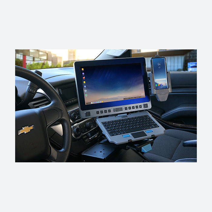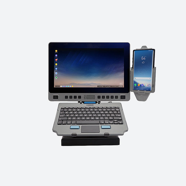 Gamber Johnson DeX heads up vehicle kit. DeX vehicle kit includes a 13.3″ touch-screen display, rugged USB hub, rugged lite keyboard, smartphone dock mounting bracket and articulating mount. Gamber-Johnson’s Heads Up DeX solution positions the smartphone in the driver’s view – use the phone as a second screen or a touchpad device.