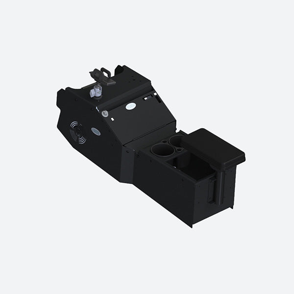 Gamber Johnson 2021+ Dodge Durango Standard Console Box Kit with Printer Mount, Magnetic Phone Holder, Cup Holder, and Rear Armrest. Console rear armrest features multiple armrest mounting locations for optimal comfort while out in the field.