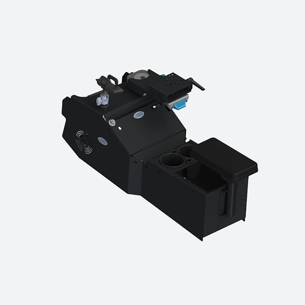 Gamber Johnson 2021+ Dodge Durango Standard Console Box Kit with Printer Mount, Magnetic Phone Holder, Cup Holder, Rear Armrest, and Mongoose XLE 9-in. Motion Attachment. This Gamber Johnson console keeps devices easily accessible while providing a secure mounting space for the Brother PocketJet printer, creating a rugged and reliable mobile workstation.