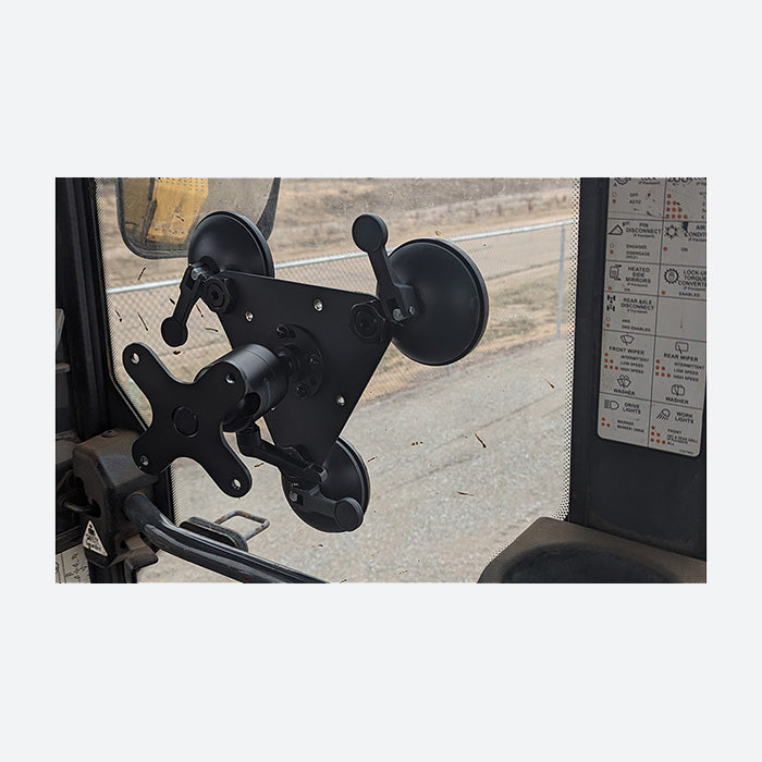 Gamber Johnson 7170-1079 kit combines Tri-Suction Cup Mount and with the Zirkona Large Joiner assembly. This mounting kit is designed to attach to glass in enclosed cabs where there are limited mounting locations. The mount combines the holding strength of three (3) Zirkona Suctions Cups for optimal holding.
