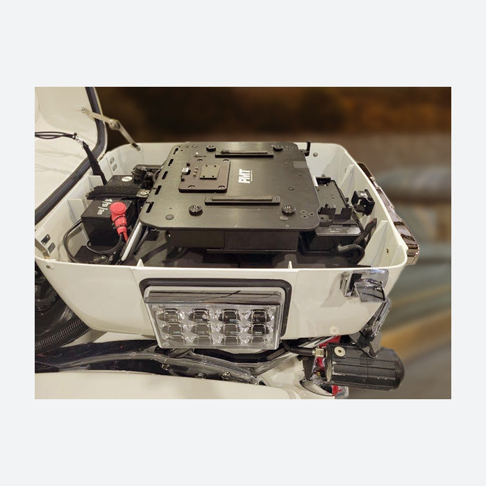 Motorcycle Mount securely mounts inside the motorcycle carrier without restricting access to other electronics housed inside. The mount allows the laptop and dock to be raised up and out of the carrier for easy access to the device and tucked away for storage when not in use.